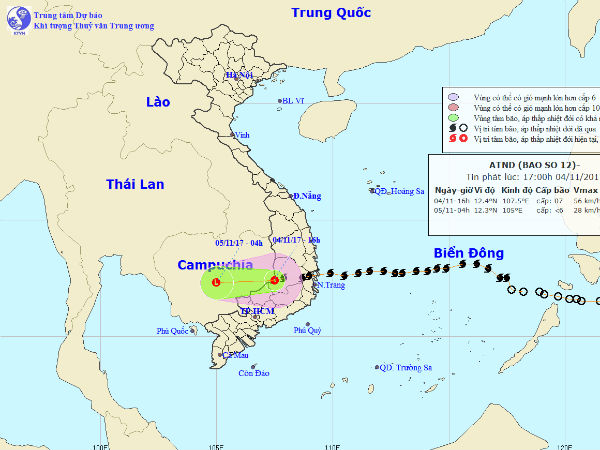 Theo Trung tâm Dự báo Khí tượng Thủy văn Trung ương, vào chiều ngày 4/11, sau khi đi vào đất liền phía Nam Tây Nguyên, bão số 12 đã suy yếu dần thành áp thấp nhiệt đới.
