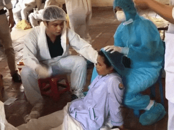 Nữ nhân viên ngồi bệt xuống sàn, kiệt sức sau nhiều giờ lấy mẫu xét nghiệm Covid-19, nhiều nhân viên khác phải đỡ, quạt giúp đồng nghiệp hồi sức.