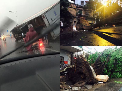 Chiều nay, một cơn mưa giông lớn với gió giật khủng khiếp đã biến đường phố Hà Nội thành một "bãi chiến trường" thực sự với cây cối đổ rạp khắp nơi, thậm chí làm bật cả vỉa hè, lật ô tô tải và có cả người chết.