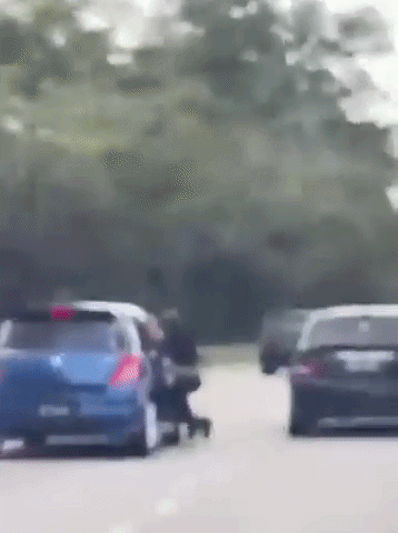 Khoảnh khắc gã đàn ông ngã lộn nhào xuống đường sau khi bám nắp ca-pô xe vợ cũ suốt 2km