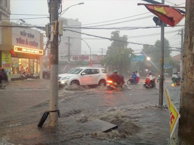 Mưa lớn do ảnh hưởng của áp thấp nhiệt đới, nhiều tuyến đường ở Nha Trang (Khánh Hòa) ngập nặng, giao thông và cuộc sống của người dân đảo lộn.
