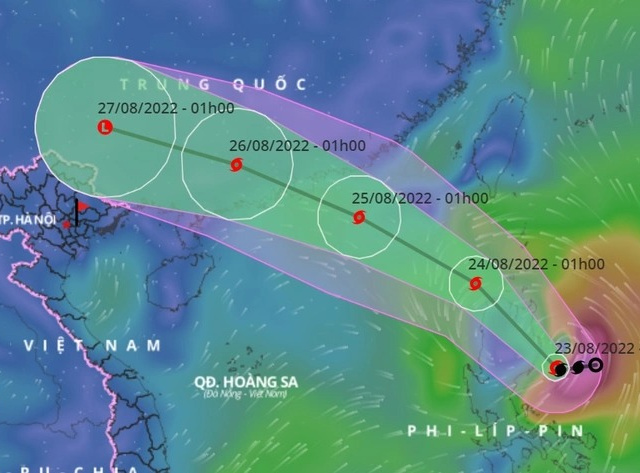 Dự báo bão di chuyển nhanh với tốc độ 20 - 25km/h theo hướng Tây Tây Bắc. Đến 4h ngày 25/8, tâm bão ở trên khu vực Bắc Biển Đông.