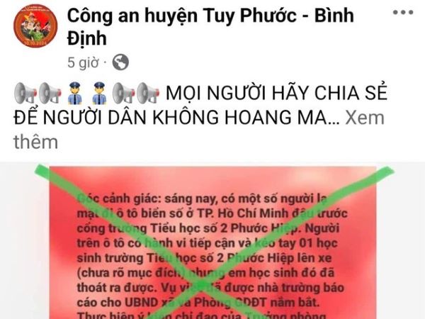 Tối 13/2, trao đổi với PV Tiền Phong, ông Nguyễn Hùng Tân – Phó Chủ tịch UBND huyện Tuy Phước (tỉnh Bình Định), cho biết, thông tin "bắt cóc trẻ em" lan truyền trên mạng xã hội gây xôn xao dư luận là hoàn toàn sai sự thật.