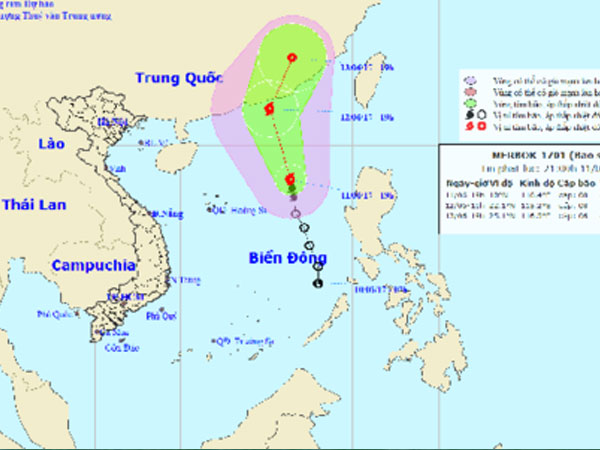 Trung tâm Dự báo khí tượng thủy văn Trung ương cho biết, vào hồi 16 giờ ngày 11/6, vị trí tâm bão số 1 (có tên quốc tế là Merbok) ở vào khoảng 17,5 độ vĩ Bắc; 116,5 độ kinh Đông, cách quần đảo Hoàng Sa khoảng 440 km về phía Đông.