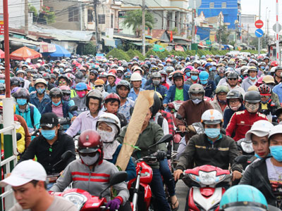 Sáng 4-2, người dân tại TP.HCM ùn ùn kéo nhau về quê ăn tết khiến nhiều tuyến đường xảy ra tình trạng kẹt xe.