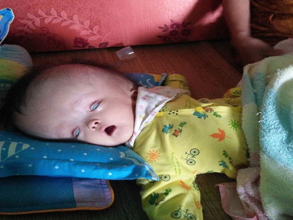 Bé Hoàng Thị Hoài Thương (8 tháng tuổi, ngụ khối 3, phường Nghi Hương, thị xã Cửa Lò, tỉnh Nghệ An) bị bệnh não úng thủy với cái đầu to quá cỡ che lấp hết khuôn mặt xinh xắn.