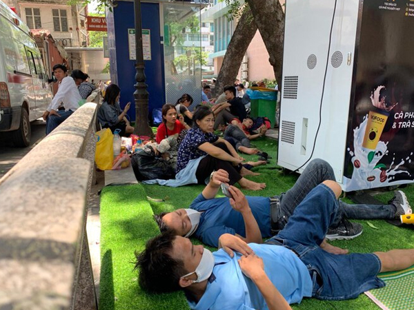 Nhiều người nhà bệnh nhân ở bệnh viện Bạch Mai vật vờ, mệt mỏi ngồi ngoài hành lang, ngả lưng nghỉ ngay trên bậc thềm dưới thời tiết nắng nóng lên đến 40 độ C.