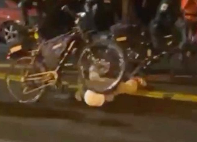 Một cảnh sát ở thành phố Seattle, bang Washington (Mỹ) dắt xe đạp qua đầu một người biểu tình đang nằm trên mặt đường.