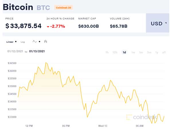 Sau đợt giảm nhẹ, giá bitcoin bật tăng trở lại lập ngưỡng mới 34.500 USD/bitcoin. Nhà đầu tư tiếp tục lạc quan vào đồng tiền ảo này.
