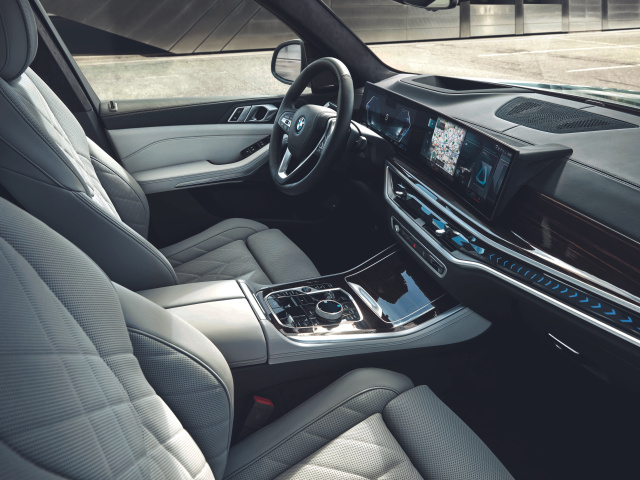 BMW X5 2024 làm mới ở bảng điều khiển hàng ghế trước, màn hình cong 12,3 inch và 14,9 inch hệ điều hành iDrive 8.0 trong khi đối thủ Mercedes-Benz GLE cũng dùng màn hình lớn cảm ứng 12,3 inch, có điều khiển bằng giọng nói và trợ lý ảo MBUX.