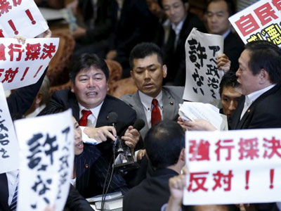 Ngày 15-7, Quốc hội Nhật vốn rất trật tự đột nhiên trở nên náo loạn khi các nghị sĩ đối lập nổi loạn để phản đối dự luật an ninh của Thủ tướng Shinzo Abe nhưng bất thành.