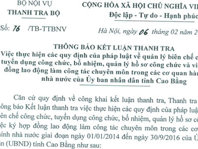 UBND tỉnh Cao Bằng đã bổ nhiệm một số trường hợp không đủ điều kiện vào chức vụ lãnh đạo, quản lý. Thanh tra Bộ Nội vụ kiến nghị tỉnh rà soát lại, nếu không phù hợp cần miễn nhiệm ngay.
