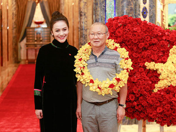 Trương Huệ Vân chọn chiếc áo dài nhung, chuẩn bị kỹ lưỡng chào mừng thầy trò đội tuyển U23 Việt Nam.