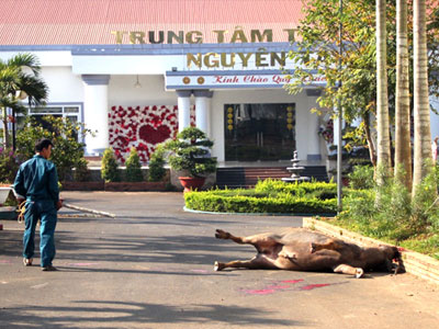 Sau khi húc 3 người trên đường, con trâu khoảng 200 kg bị cơ quan chức năng ép vào trong khuôn viên trung tâm tiệc cưới, bắn gục bằng 5 phát súng.