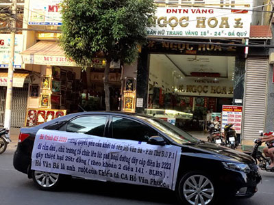 Băng rôn căng trên ôtô của bà Huỳnh Thị Lệ Trinh - chủ khách sạn 2222 phường 5 TP.Mỹ Tho tố phó bí thư đảng ủy P.1 TP. Mỹ Tho đã phá cáp điện khách sạn của bà.