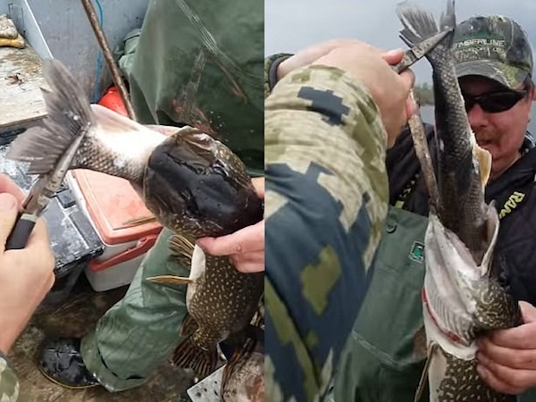 Khi được kéo ra ngoài, có thể thấy rõ hai con cá to gần bằng nhau.