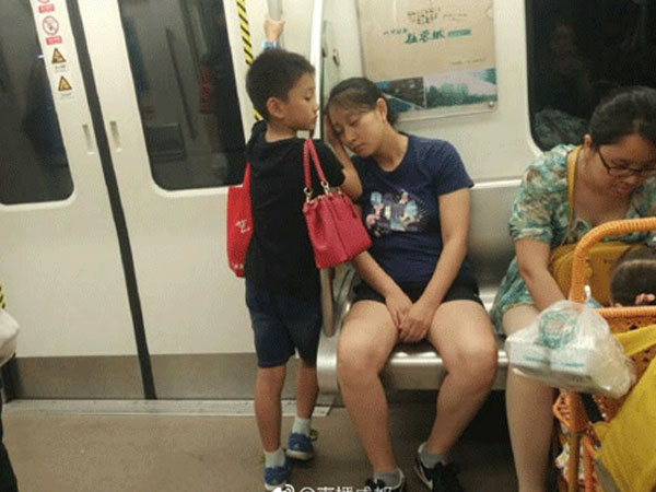 Cậu bé đứng kê tay cho mẹ ngủ ngon trên tàu điện ngầm