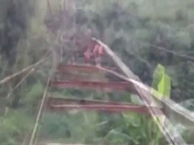 Nhìn cảnh các em nhỏ phải đi trên tấm ván gỗ rộng có 40cm trên cây cầu hỏng bắc qua suối sâu, người xem không khỏi hoảng sợ.