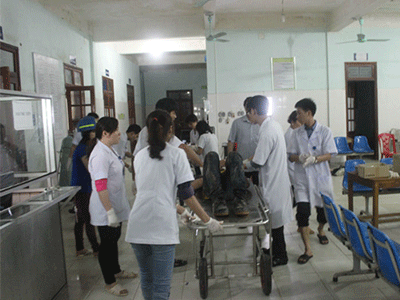Trong đêm, số lượng công nhân bị thương rong vụ sập giàn giáo công trường Formosa được đưa vào Bệnh viên Đa khoa huyện Kỳ Anh (Hà Tĩnh) ngày một đông. Những ca nặng được xe cứu thương đưa ra Bệnh viện Đa khoa tỉnh Hà Tĩnh chữa trị.