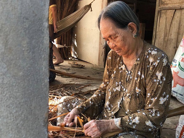 Trong cái nắng chiều chạng vạng, hình ảnh cụ bà 80 tuổi ngồi cặm cụi vót từng tàu cau kiếm tiền chữa bệnh không khỏi khiến người khác chạnh lòng.