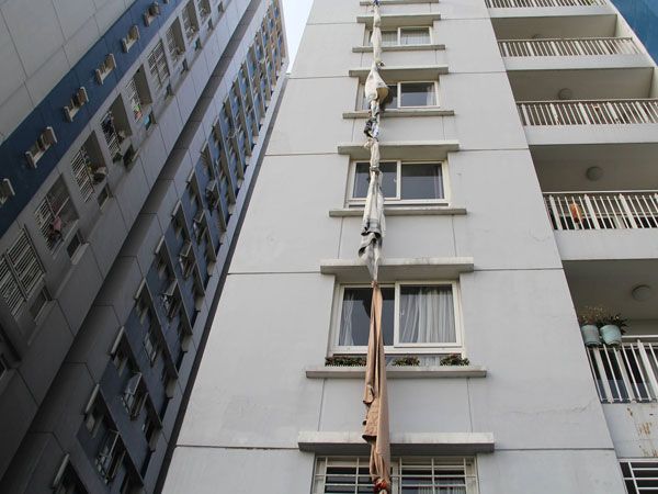 Để thoát nạn, nhiều người sinh sống tại chung cư Carina Plaza đã phải sử dụng thang dây cùng nhiều vật dụng khác trong nhà như chăn mền, rèm cửa, dây điện... buộc lại làm dây đu xuống đất.