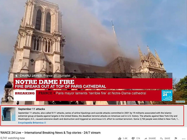 Công cụ dùng để kiểm chứng tin giả của YouTube đã bộc lộ điểm yếu khi cho rằng vụ cháy nhà thờ Đức Bà Paris là sự kiện khủng bố 11/9.