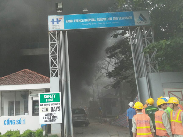 Khoảng 14h25, công trình bên trong bệnh viện Việt Pháp, phố Phương Mai, Hà Nội bất ngờ bốc cháy dữ dội. Hàng trăm công nhân đang làm việc bên trong tháo chạy tán loạn.