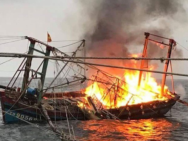 Tàu cá mang số hiệu TH 90568TS bất ngờ bốc cháy, 7 ngư dân trú tại phường Quang Tiến, TP.Sầm Sơn, tỉnh Thanh Hóa buộc phải nhảy xuống biển trong đêm và được tàu cá ở gần đó cứu sống.