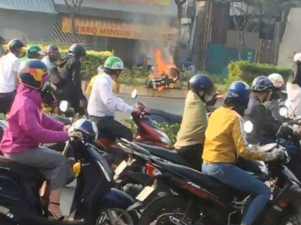 Chiếc xe máy đang lưu thông bỗng nhiên chết máy rồi bất ngờ bốc cháy dữ dội.