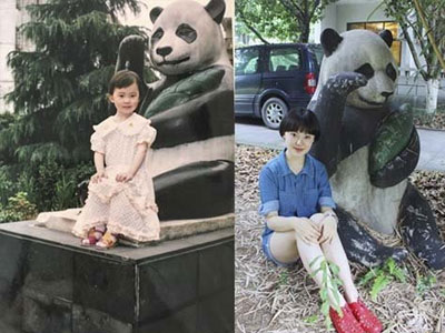 Sau 19 năm, cô sinh viên trẻ đã tái hiện lại những tư thế chụp ảnh ngày thơ bé.