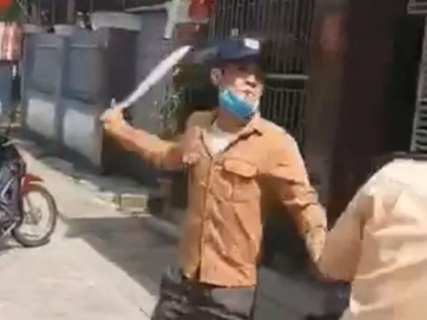 Người đàn ông mặc áo đỏ đã dùng dao rựa chém liên tiếp nhiều phát về phía lực lượng CSGT khiến cán bộ CSGT phải dùng gậy đánh trả.