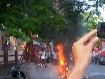 Xe máy chở hai ông cháu khi đang dừng trước vạch đèn đỏ thì bốc cháy dữ dội khiến hai nạn nhân bị thương phải đưa đi sơ cứu.