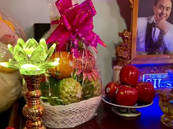 Ban thờ nghệ sĩ Chí Tài được bày biện ngăn nắp, giản dị mà trang nghiêm, sạch sẽ, đầy đủ phong thủy với hoa, quả, cây cỏ, bánh kẹo, bát hương, di ảnh, nằm riêng một góc nhỏ trong nhà thờ Tổ.