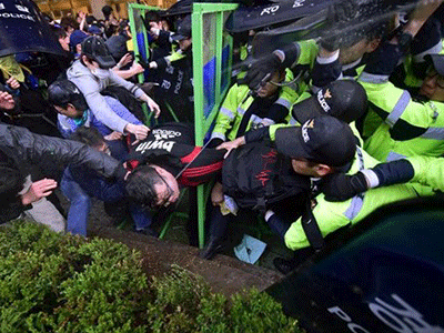 Cảnh sát Hàn Quốc xô xát với hàng nghìn người biểu tình chặn lối vào dinh Tổng thống đòi điều tra kĩ hơn về thảm kịch chìm phà Sewol.