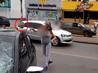 Một người phụ nữ mang bầu ở Brazil đã vô cùng tức giận khi phát hiện chồng ăn trưa với nhân tình, ngay lập tức cô ném đá không thương tiếc vào xe ô tô của chồng cho đến khi kính và nóc xe bị đập vỡ.