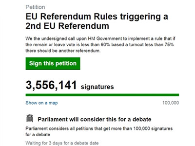 Hơn 500.000 người Anh đã ký vào kiến nghị trực tuyến của Quốc hội Vương quốc Anh, yêu cầu tiến hành một cuộc trưng cầu dân ý mới về việc ở lại hay rời khỏi Liên minh châu Âu (EU).