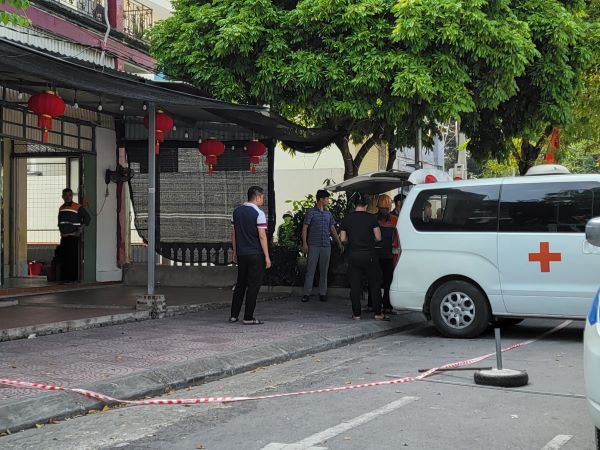 Quản lý nhà nghỉ nghe tiếng kêu cứu và chạy lên tầng 3 thì phát hiện người vợ ngã ngoài cửa phòng, người chồng nằm bất động trên giường.
