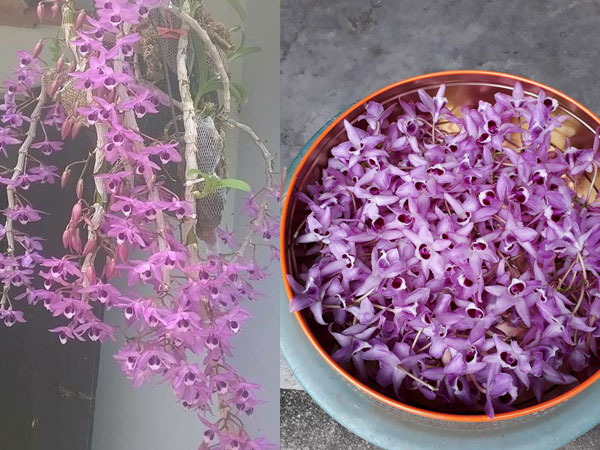 "Chồng em mê hoa hơn mê vợ. Hôm nay ở nhà em điên quá. Hai mẹ con vặt trụi giò phong lan cho vui các chế ạ...".