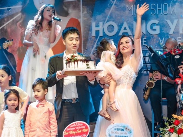 Trong đêm nhạc mừng sinh nhật, nữ diễn viên Hoàng Yến được chồng quỳ gối tặng hoa. Trước khi đến với người chồng kém tuổi, cô trải qua 3 cuộc hôn nhân đổ vỡ.