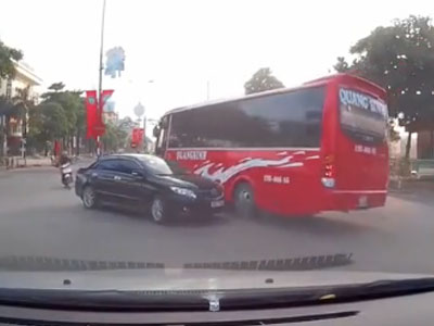 Xe khách lách rào chắn vượt đường ray trước mũi tàu hỏa