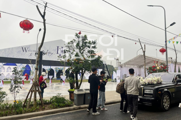 Rolls Royce rước dâu xuất hiện từ 8h sáng, phủ kín hoa tươi. Chiếc xe thu hút sự tò mò, hiếu kỳ của những người xung quanh.