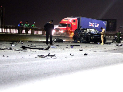 Chiếc ôtô hiệu Range Rover chạy trên cầu Sài Gòn bất ngờ tông mạnh vào đuôi xe container khiến phương tiện bay nóc, bốc khói. Đôi trai gái văng khỏi xe, một người tử vong.