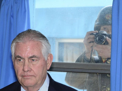 Một binh sĩ Triều Tiên đã được nhìn thấy lén chụp ảnh Ngoại trưởng Mỹ Rex Tillerson khi ông có chuyến thăm tới khu vực biên giới được trang bị vũ khí dày đặc nhất thế giới.