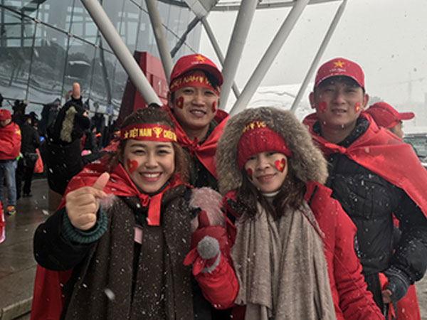 Các cổ động viên đang rất háo hức vào sân để cổ vũ cho đội tuyển U23 Việt Nam, bất chấp tuyết đang rơi dày ở sân vận động Thường Châu.