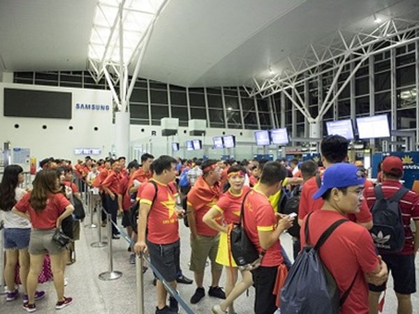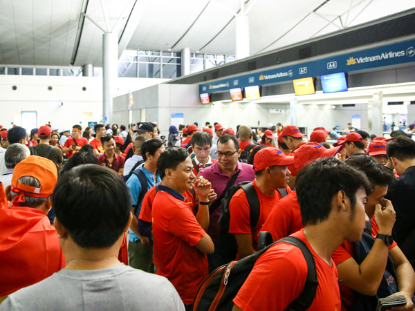 Sáng sớm 29/8, hàng trăm cổ động viên đã có mặt tại sân bay quốc tế Tân Sơn Nhất để chuẩn bị lên đường sang Indonesia, cổ vũ cho Olympic Việt Nam ở trận bán kết gặp Hàn Quốc.