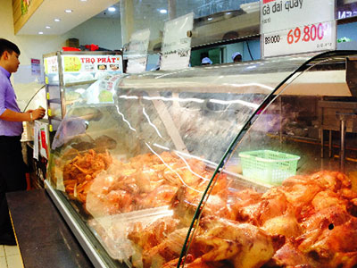 Nếu trước đây phải trên 100.000 đồng mới mua được con gà quay thì nay tại các hệ thống siêu thị giá bán chỉ vài chục nghìn đồng.
