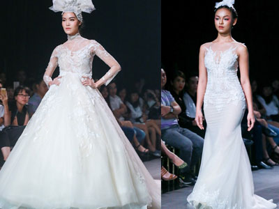 Cùng giữ vai trò vedette trong show trình diễn váy cưới, người mẫu Mai Ngô và Hoa hậu Thuỳ Dung phô diễn sắc vóc “một chín một mười”.