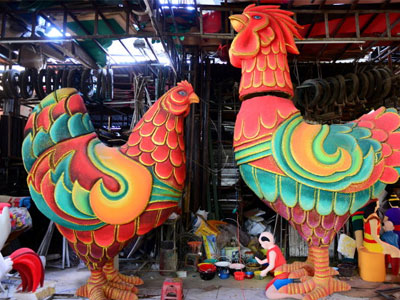 Linh vật tượng trưng cho con giáp của năm gồm gà trống cao 3,5m, gà mái cao 2,8m cùng 15 chú gà con đang trong giai đoạn hoàn thiện để chuẩn bị đem ra trưng bày tại phố đi bộ Nguyễn Huệ tết này.