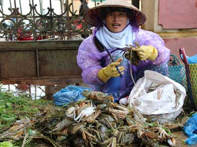 Nhiều hộ dân vùng biển Kim Sơn (Ninh Bình) phải thu hoạch cua nuôi trong đầm đem bán vội cho thương lái với giá rẻ vì lo sợ mất trắng sau bão.
