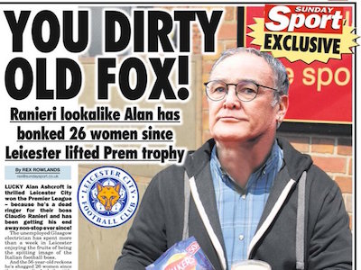 "Người đàn ông giống HLV Ranieri tên là Alan đã ngủ với 26 người phụ nữ kể từ khi Leicester vô địch Premier League", đó là thông tin được tờ Sunday Sport giật ra trang bìa số ra mới nhất.